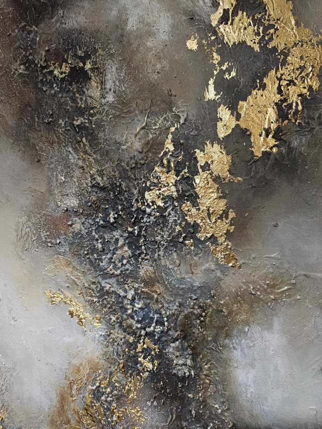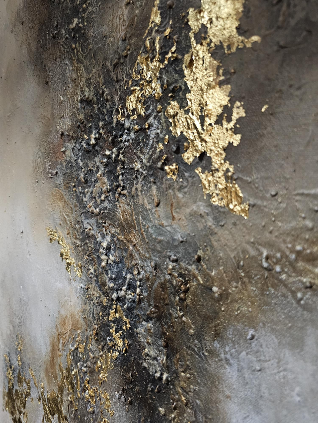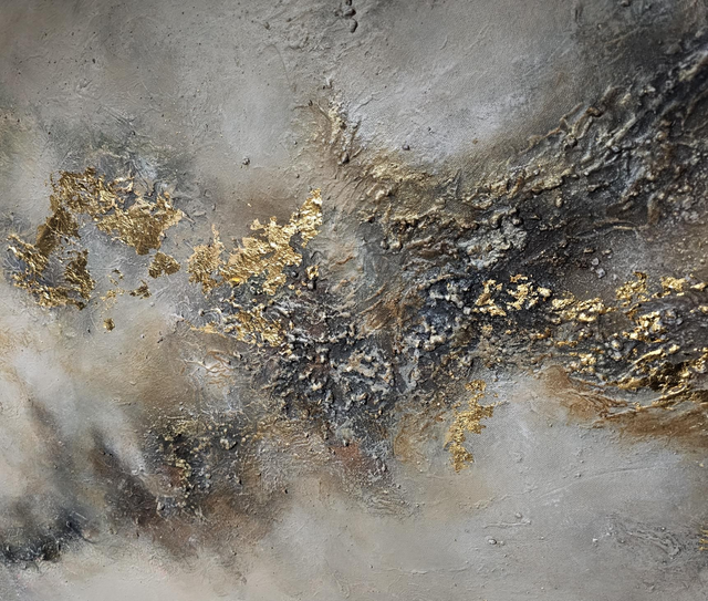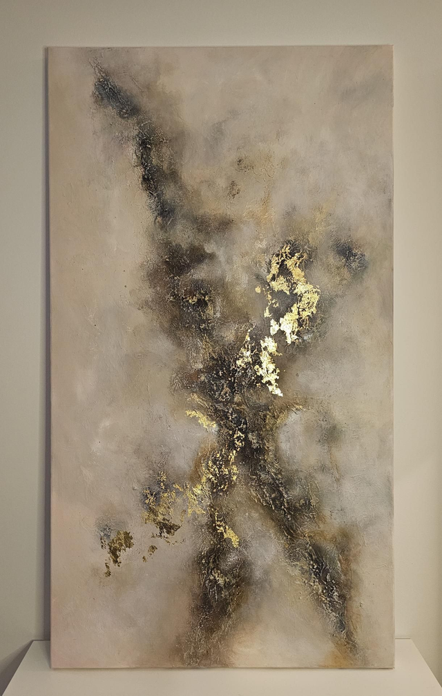Abstrakti maalaus luonnollisilla beigen, harmaan, ruskean ja kullan sävyillä. Sopii pystyyn tai vaakaan.